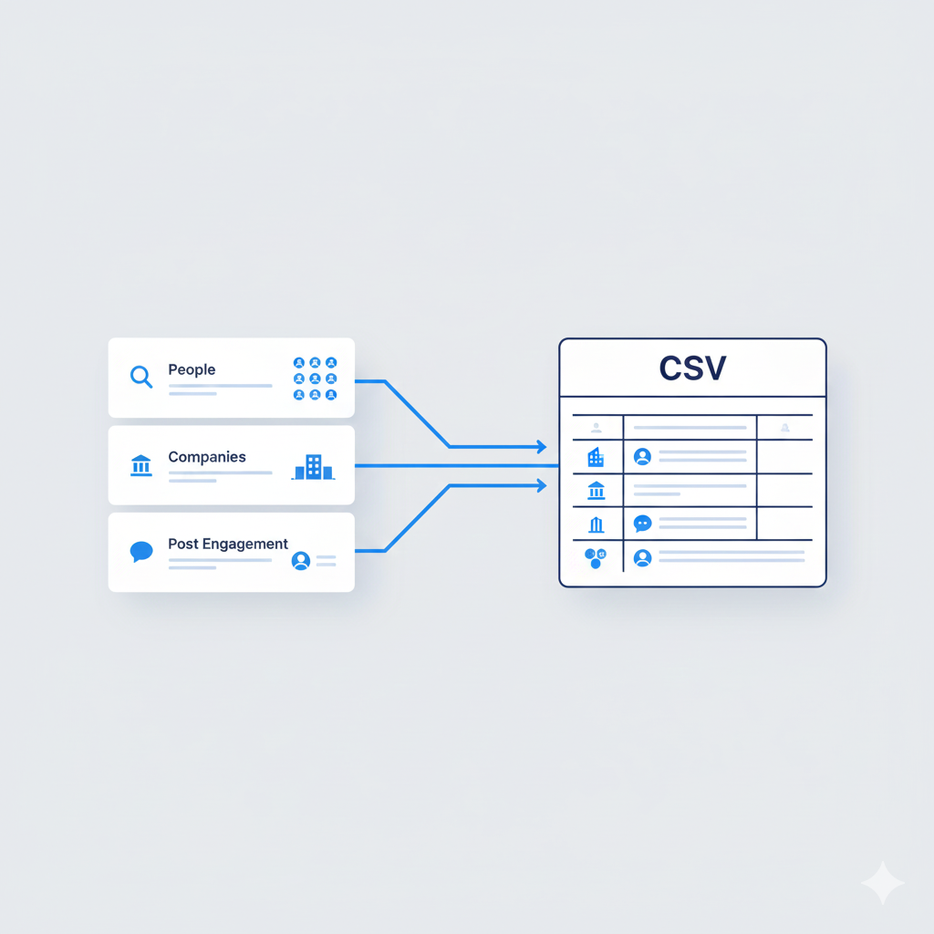 Download any LinkedIn search, Sales Navigator list, or profile data to CSV. Includes verified emails and phone numbers — ready for your CRM.