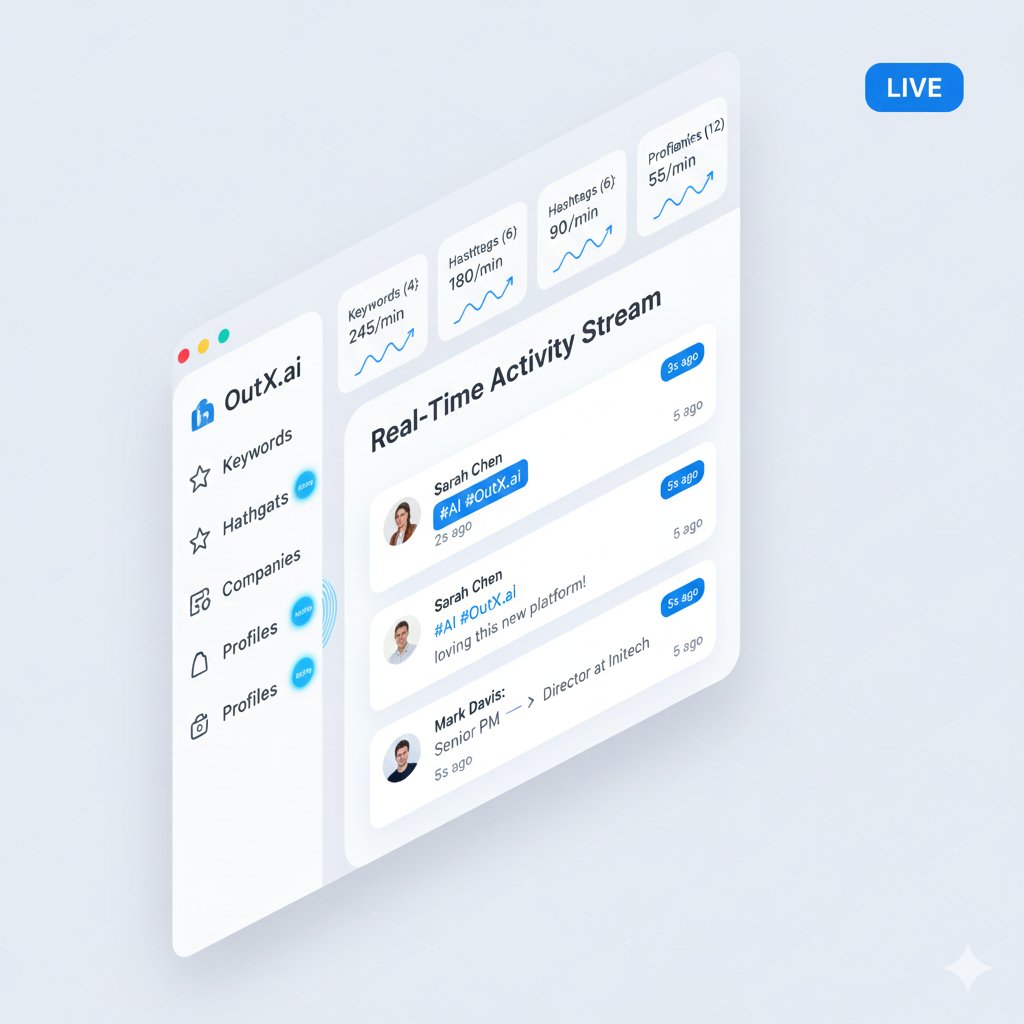 Track keywords, hashtags, companies, and profiles in real-time across LinkedIn. Never miss a post, comment, or job change.