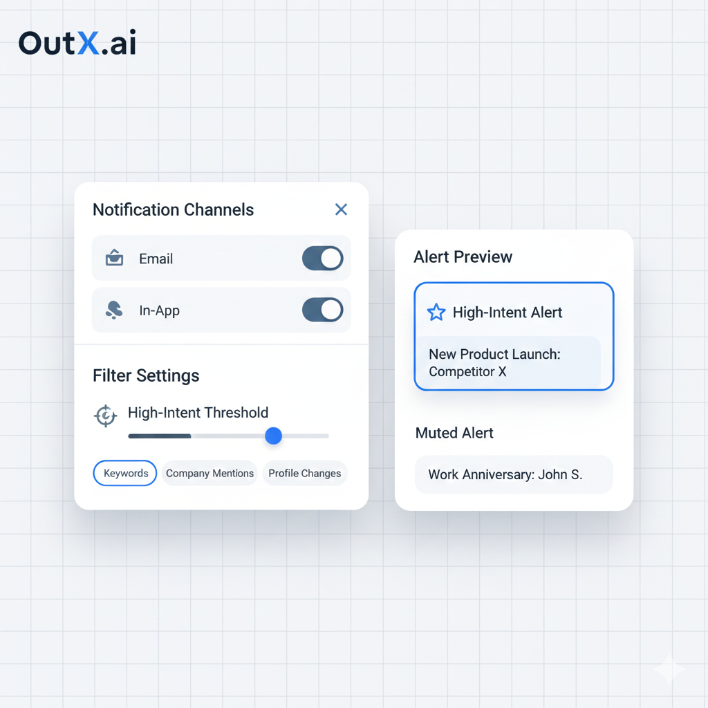 Choose how you want to be notified: email, Slack, or in-app alerts. Set filters for noise vs. high-intent matches.