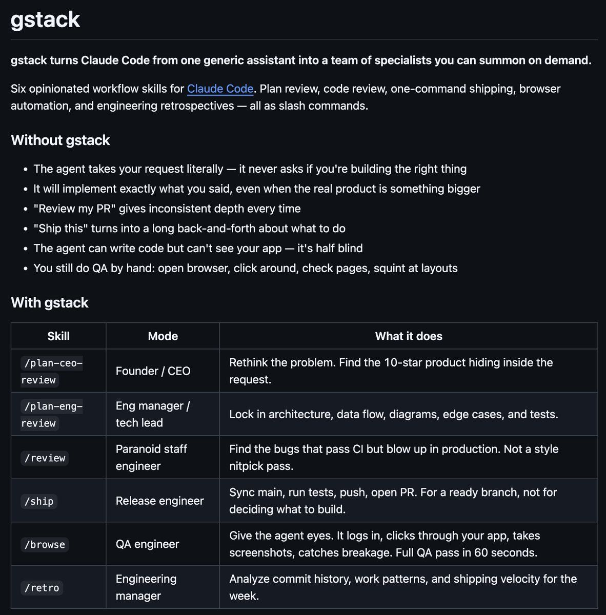 I just open sourced my entire Claude Code setup I used to average 10K LOC and 100 PR's per week in the last 50 days. I am particularly proud of building a 200ms browser skill /browse that uses Bun and Playwright to outperform Claude for Chrome MCP by being 20x faster with no context bloat to let you test any app fast. It's the full package: CEO, design, dev, test.